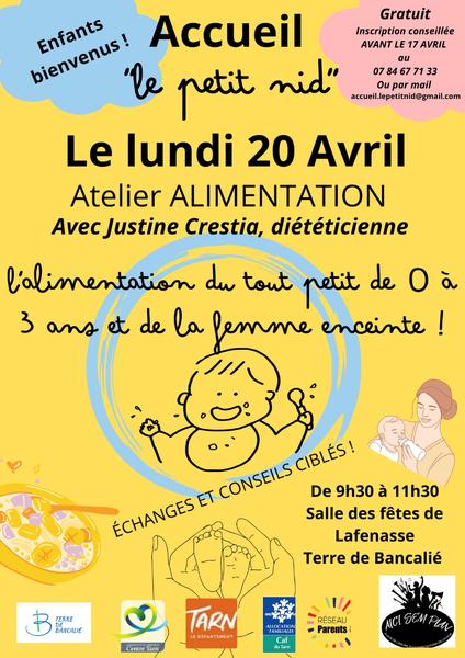 Justine Crestia, diététicienne, qui répondra à toutes vos questions sur l’alimentation du tout-petit (de 0 à 3 ans) et de la femme enceinte. Nous vous conseillons de vous inscrire avant le 17 avril pour l’organisation de l’atelier, par mail : accueil.lepetitnid@gmail.com ou par téléphone au 07 84 67 71 33